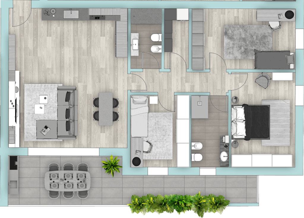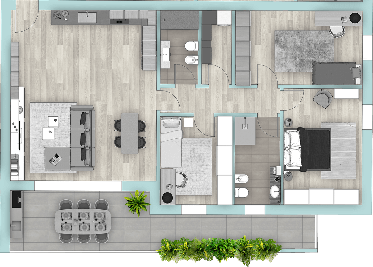 Appartamento composto da ampia zona giorno, tre camere, due bagni, ampia terrazza.