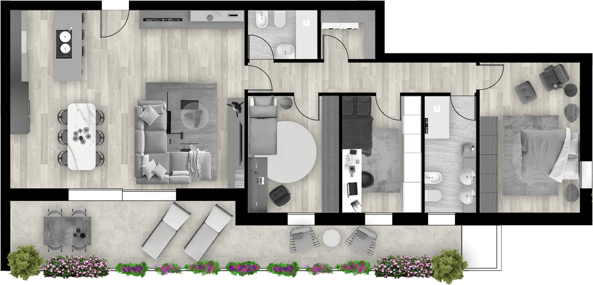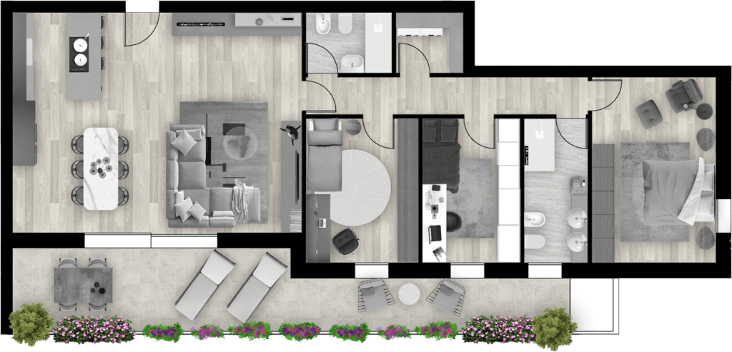 Appartamento composto da ampia zona giorno, tre camere, due bagni, ampia terrazza.