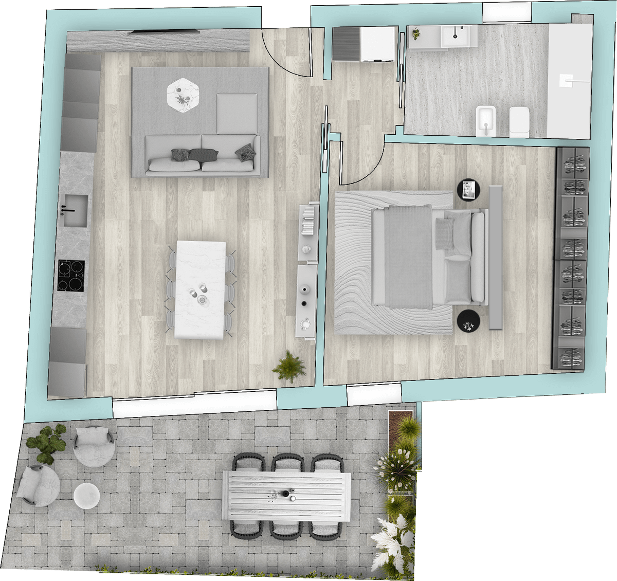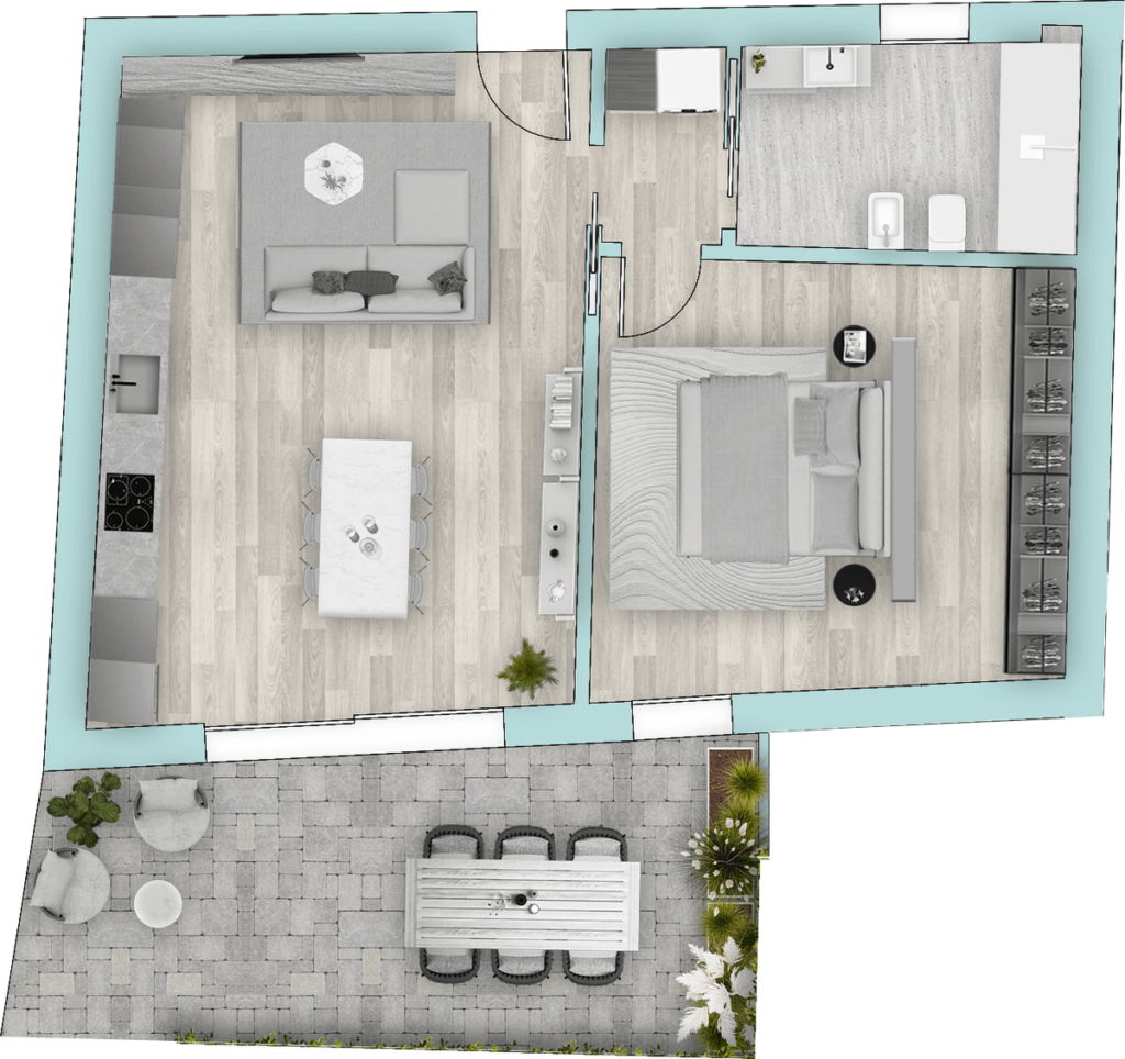 Appartamento composto da zona giorno, camera, bagno, giardino.