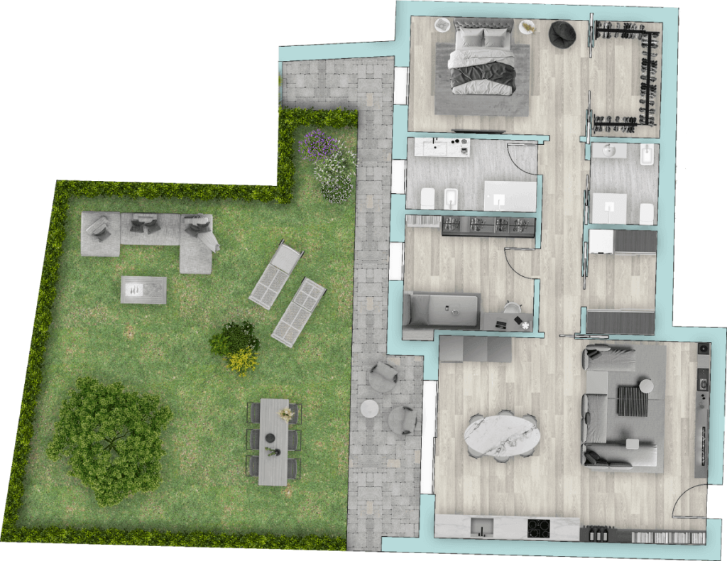 Appartamento composto da ampia zona giorno, due camere, due bagni, ampio giardino.