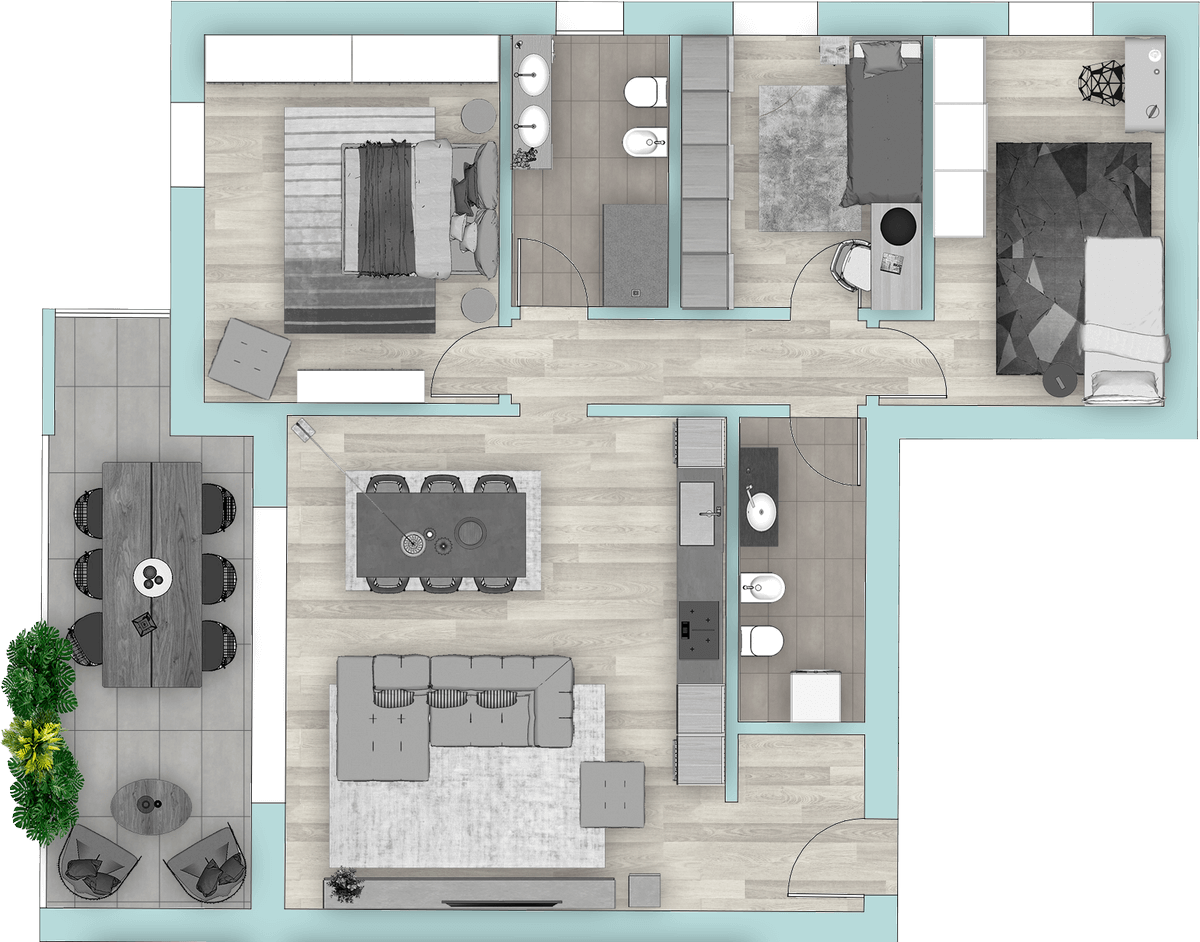Appartamento composto da ampia zona giorno, tre camere, due bagni, ampia terrazza.